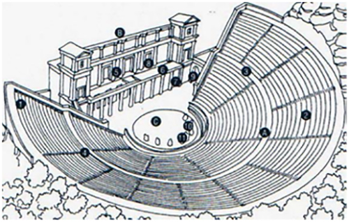 Le rappresentazioni avvenivano in quella che era chiamata cavea, circondata da gradoni (prima di legno poi in pietra) e disposti a forma circolare. Davanti c’era una piattaforma rialzata, dove recitava l’attore che in seguito diventeranno più di uno. Ai piedi di questa piattaforma c’era il coro.